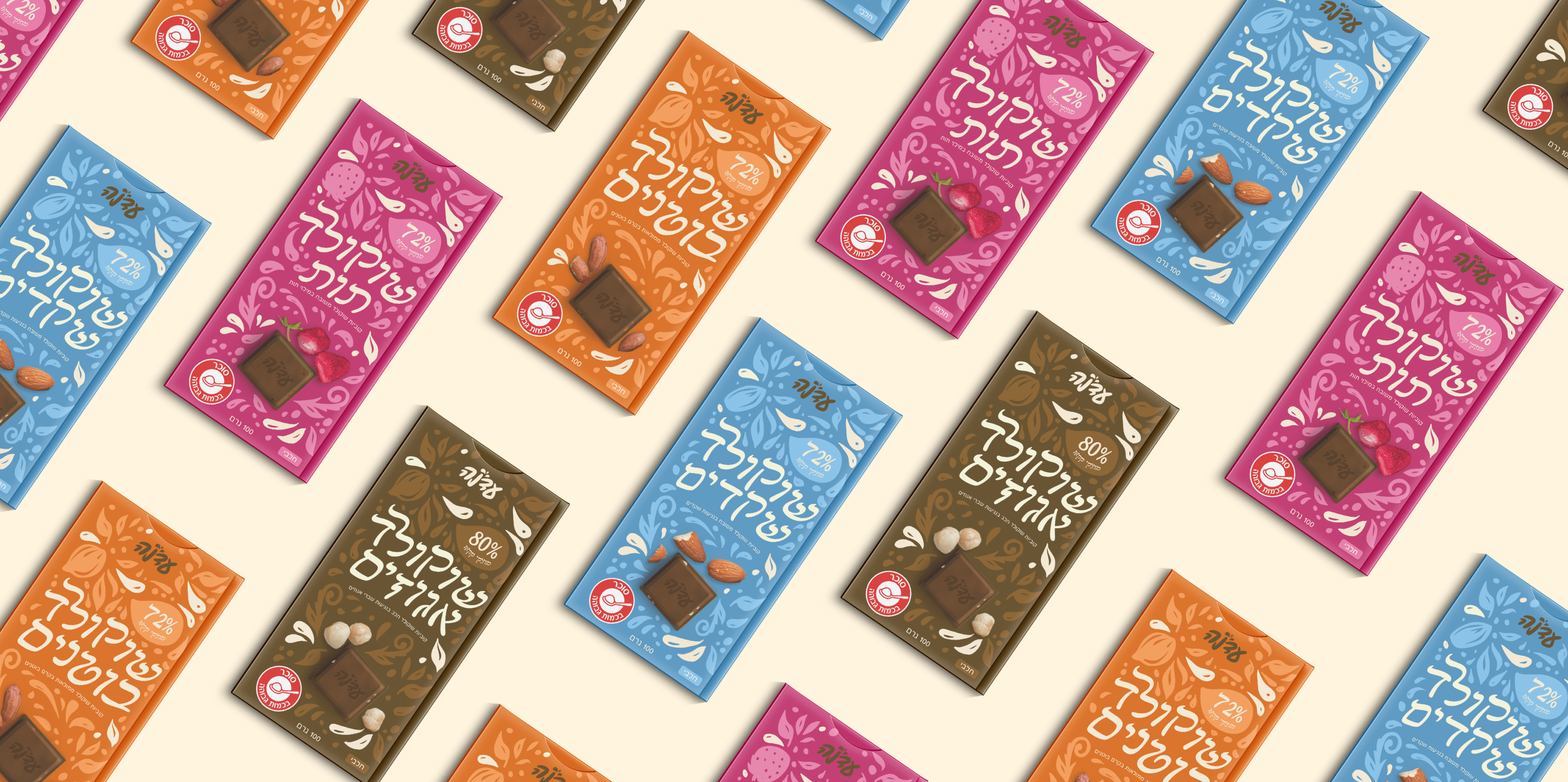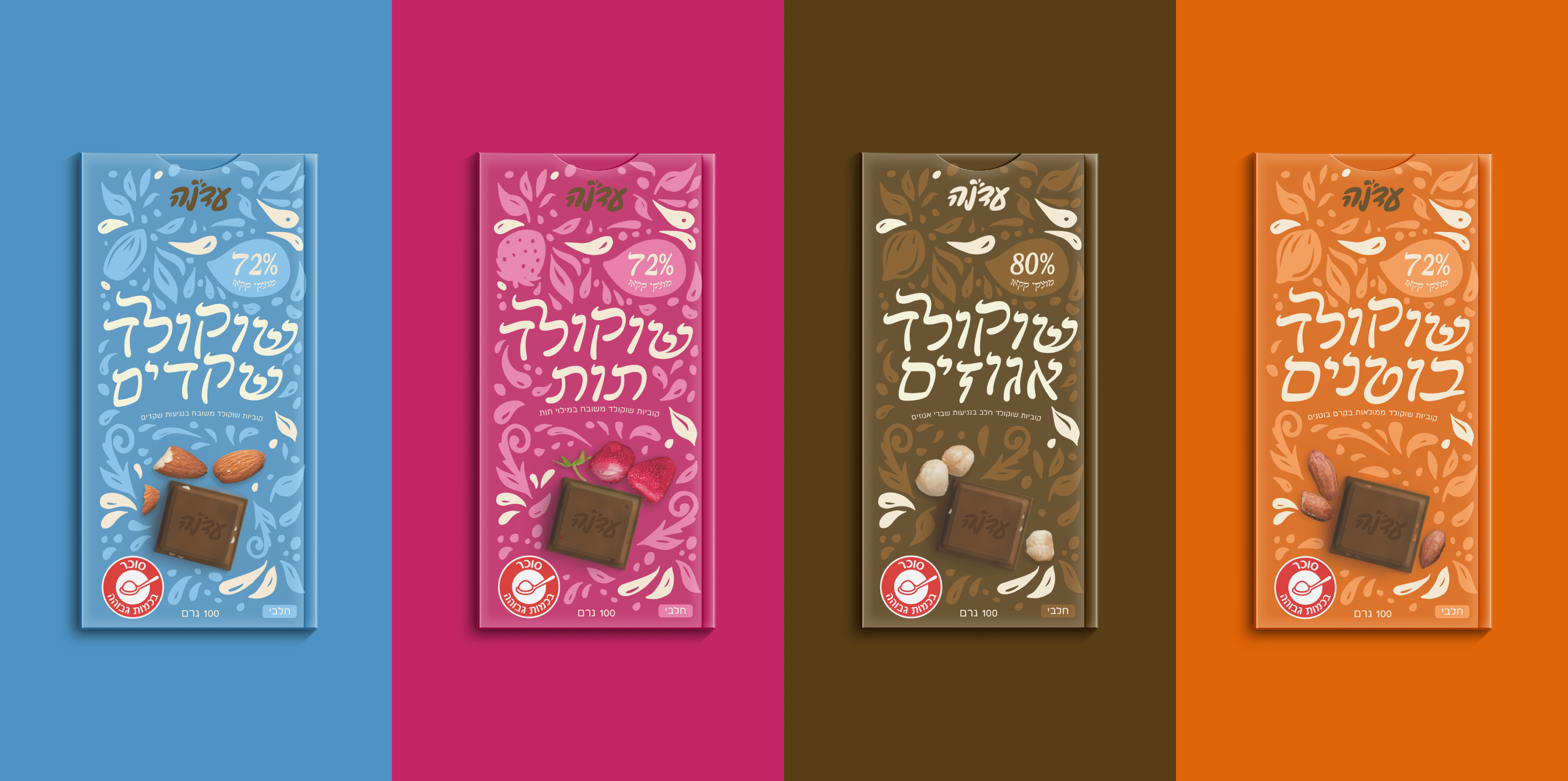 שם החברה הנבחר 'עדנה' שם ישראלי מובהק מלא נוסטלגיה. בעיצוב רציתי לתת משהו חדש ולא מוכר בעל נראות חזקה על המדפים. בחרתי בצבעים חזקים וצבעוניים שונים מאוד מאריזות השוקולד הנמצאות על המדפים. על האריזות ישנם טקסטים בעברית בלבד כדי לחזק את התחושה של הישראליות. השפה העיצובית מלאה באיורים מלאי חוויה והתלהבות שנותנים תחושה של חוויה והתרגשות.