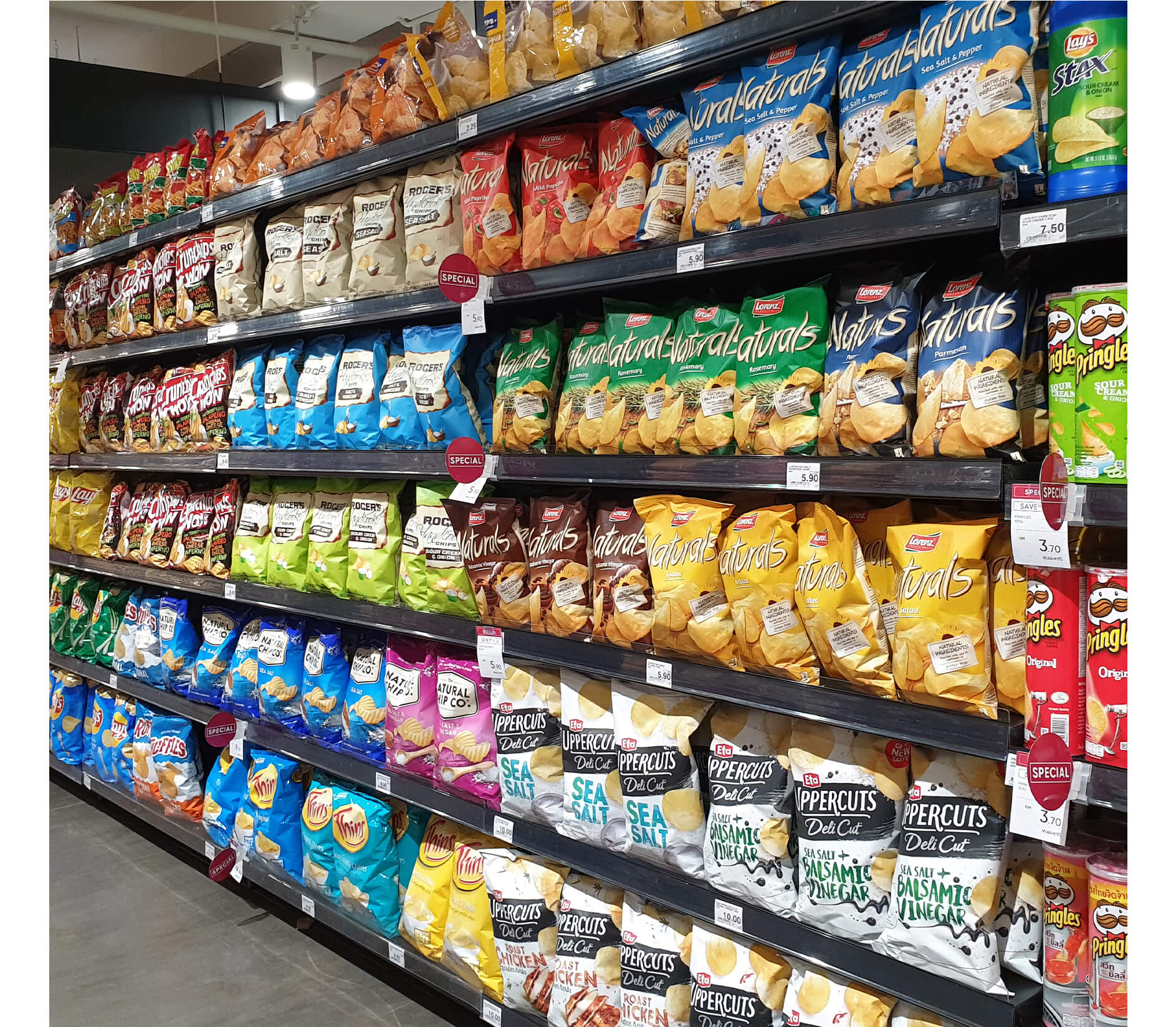 מיתוג חזק, צבעוניות בולטת, שקיפות (לעיתים), סמלים של תקנים (כשרות, בריאות).